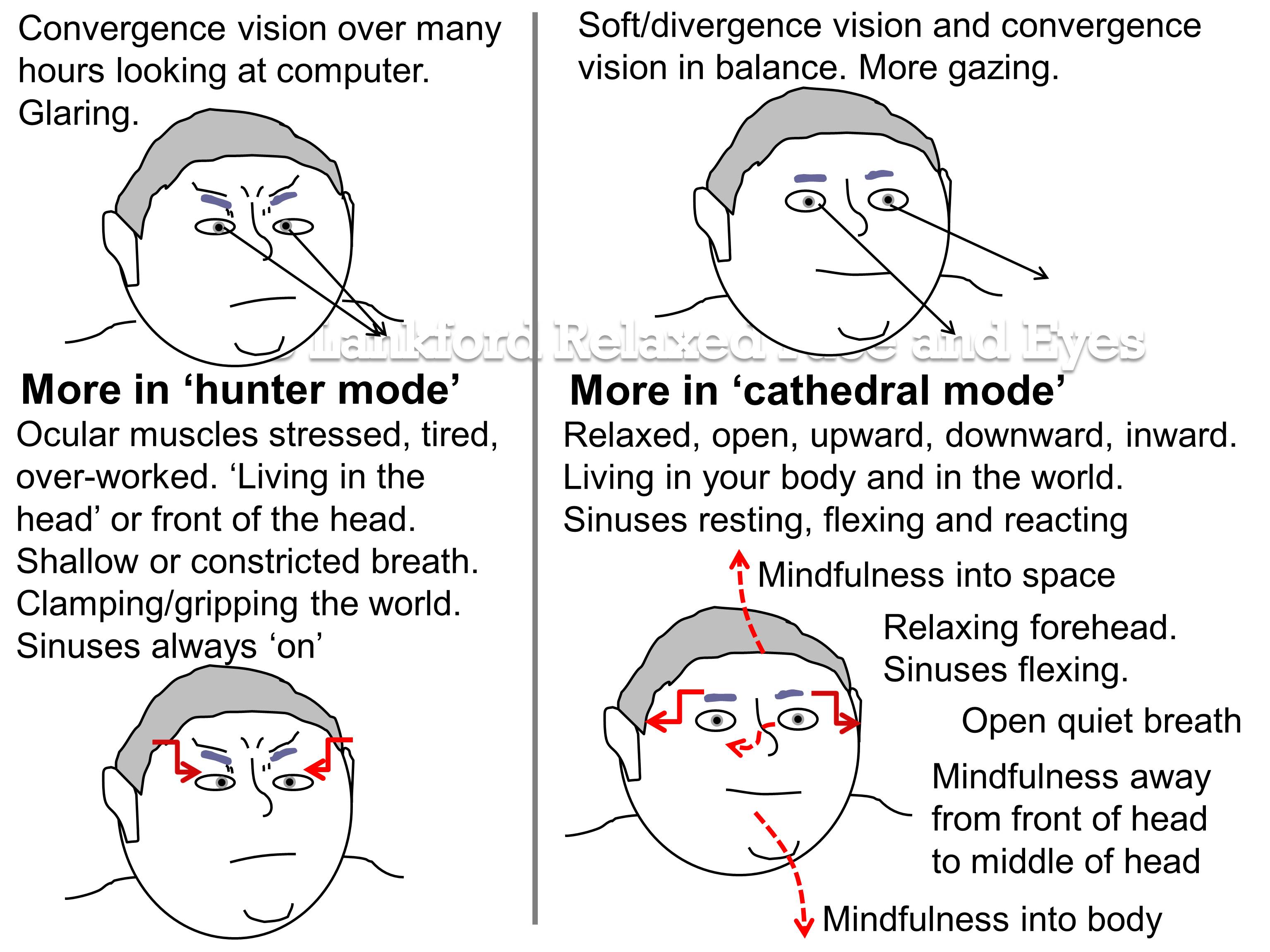 I reduced these problems by learning to ‘relax my eyes’, unfrown my face, breathe more deeply and be more in my body. I learnt to put space in my forehead – I found out what was meant by the ‘third eye chakra’ and started to sense, and even influence, the health and openness of my sinuses.