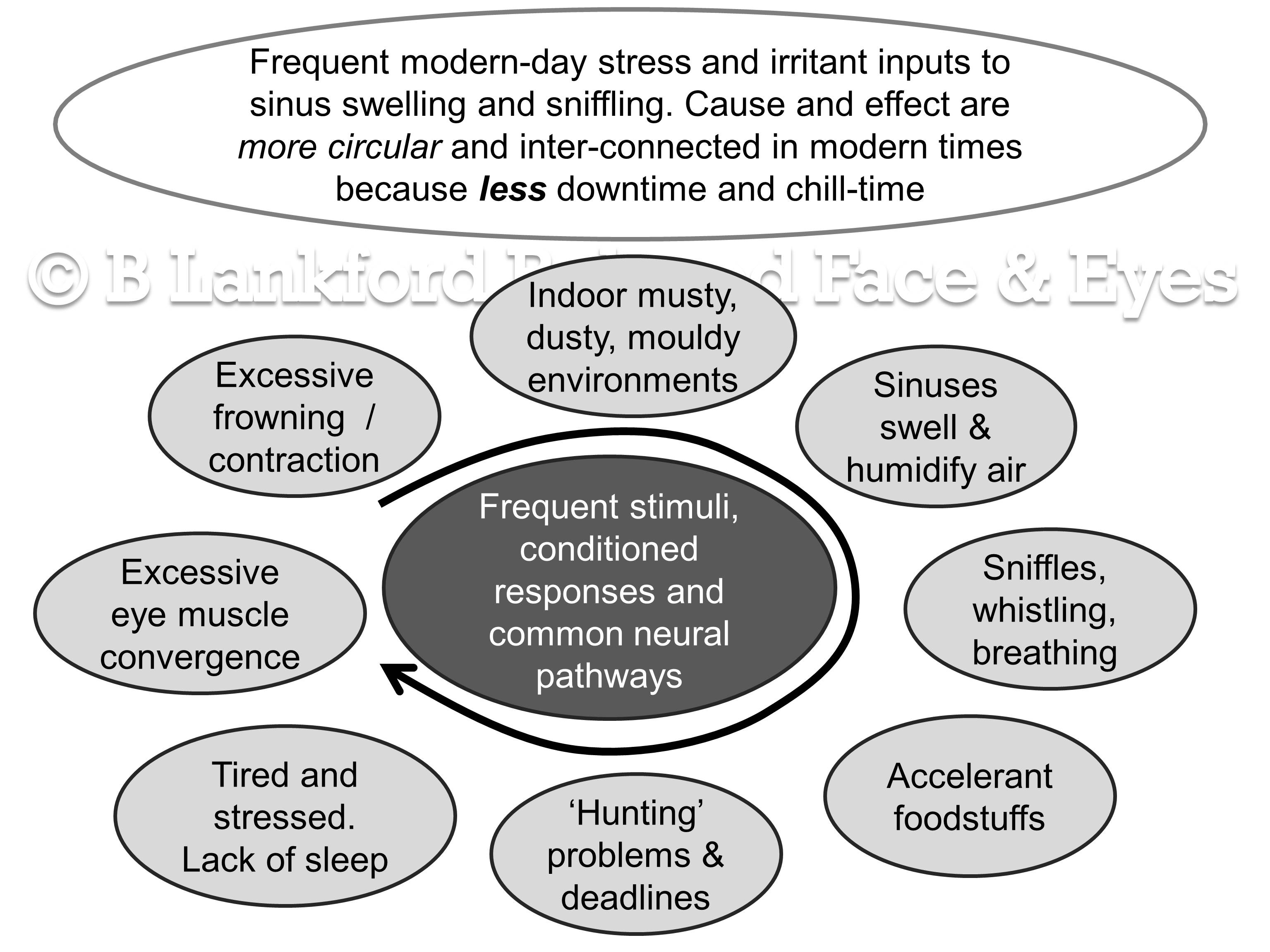 I not convinced that these functions provide the whole story. When I started to unfrown – my sinuses (or more accurately my nasal breathing) became freer, less sniffly and more ‘easy-breathing’. I blew my nose less frequently and generally felt less stuffy. And this happened quite quickly and at the same time as unfrowning. This leads me to think that frowning (and forehead/eye muscle-clenching) stimulates the nasal passages and sinuses.